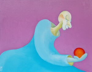 Man met ballon, golvende achtergrond, olieverf op linnen, 40 bij 30 cm, Pictoright 2016.