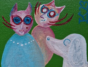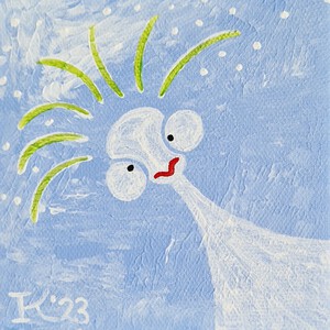 2023Acrylverf op katoen, 10 bij 10 cm, dit werkje kan opgehangen worden. De achtergrondkleur is in werkelijkheid lichter, dus voor aanschaf even beeldbellen is handig. Pictoright. Dit werk is tot en met eind december in de bibliotheek in Oegstgeest te zien en te koop. Lange Voort 21, naast de Hema. Ma. 14.00 tot 18.00 uur, di. t/m za 10.00-18.00 uur.