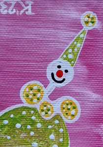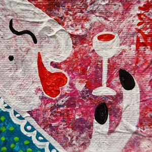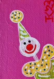Acrylverf op katoen, 10 bij 10 cm, voorzien van haakjes en draad aan de achterkant, zodat je het schilderijtje makkelijk op kunt hangen. Pictoright. De prijs is zonder verzendkosten.