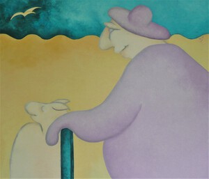 Dame aan het strand wordt aangenaam verrast door een ballon, olieverf op linnen, Pictoright 2016. Dit schilderij is niet ingelijst, de prijs is exclusief verzendkosten.