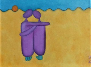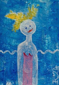 Minischilderijtje, 10 bij 7 cm, acrylverf op katoen, met ophanghaakje, Pictoright. Als je je abonneert op mijn maandelijkse gratis nieuwsbrief, zie linksonder bij ‘contact’, ontvang je 10% korting bij aanschaf van dit werkje. De prijs is inclusief verzendkosten binnen Nederland.
