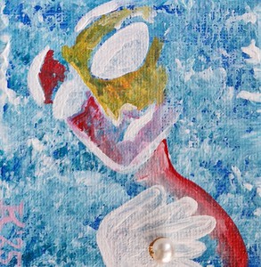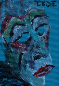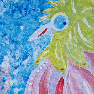 2022Minischilderijtje, 7 bij 5 cm, acrylverf op katoen, met ophanghaakje, Pictoright 2022. Om de juiste kleur te laten zien is het handig om voor aanschaf even te beeldbellen, want in werkelijkheid is de achtergrond meer donker turquoise.