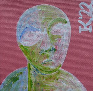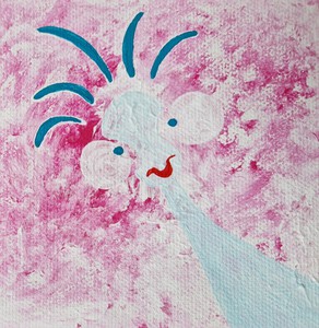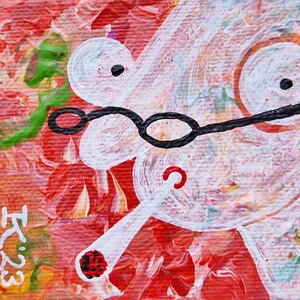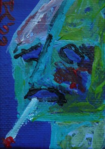 Minischilderij - 5 bij 5 cm - van een rokend/paffend figuurtje, acrylverf op katoen, Pictoright 2020.