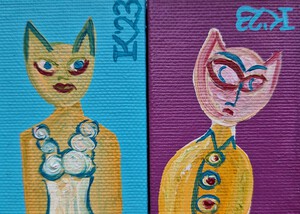 2023Twee minischilderijtjes, 7 bij 5 cm, olieverf op katoen, met ophanghaakjes, Pictoright 2023. Twintig euro per stuk. De prijs is exclusief verzendkosten.