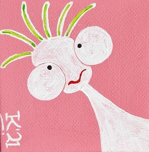 Minischilderijtje - 5 bij 5 cm - van Dotsy, een wezentje met oortjes dat een trui of jurkje draagt met zwarte stippen erop, acrylverf op katoen, Pictoright 2020.