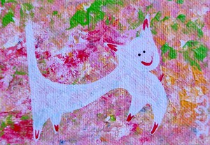 Minischilderijtje, 10 bij 10 cm, acrylverf op katoen, kan opgehangen worden.