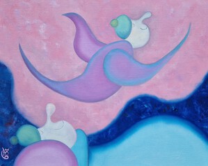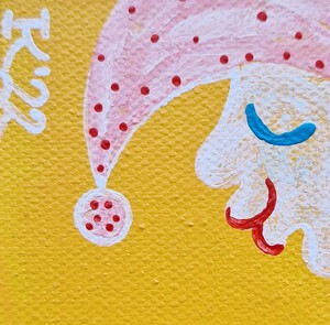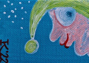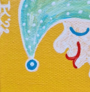 2022Uit de serie 'Slaapmutsjes' / From the series 'Nightcaps': Minischilderijtje, 7 bij 5 cm, acrylverf op katoen, met ophanghaakje, Pictoright. Als je je abonneert op mijn maandelijkse gratis nieuwsbrief, zie linksonder bij ‘contact’, ontvang je 10% korting bij aanschaf van dit werkje. De prijs is zonder verzendkosten. Mini painting, acrylic paint on cotton, 7 by 5 cm, with hanger. Pictoright. If you sign up for my newsletter, see bottom left under 'contact', you will receive a 10% discount when purchasing this work. The price does not include shipping costs.