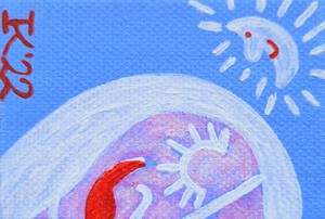 Minischilderijtje, 5 bij 5 cm, acrylverf op katoen, met ophanghaakje, Pictoright. Als je je abonneert op mijn maandelijkse gratis nieuwsbrief, zie linksonder bij ‘contact’, ontvang je 10% korting bij aanschaf van dit werkje. De prijs is zonder verzendkosten.